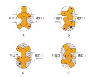 ZN3A凸輪轉子泵又稱膠體泵,三葉泵,鞋底泵等。依靠兩同步反向轉動的轉子(齒數為2-4)在旋轉過程中于進口處產生吸力(真空度),從而吸入所要輸送的物料。兩轉子將轉子室分隔成幾個小空間,并按a→b→c→d的次序運轉。運轉至位置a時,只有I室中充滿介質; 到位置b時,B室中封閉了部分介質; 到位置c時,A室中也封閉了介質; 到位置d時,A、B室與Ⅱ室相通,介質即被輸送至出料口。如此循環往復,介質(物料)即被源源不斷地輸送出。具體工作原理見示意圖。